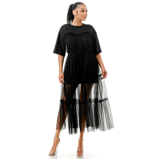 Tulle Overlay Midi T-Shirt Dress