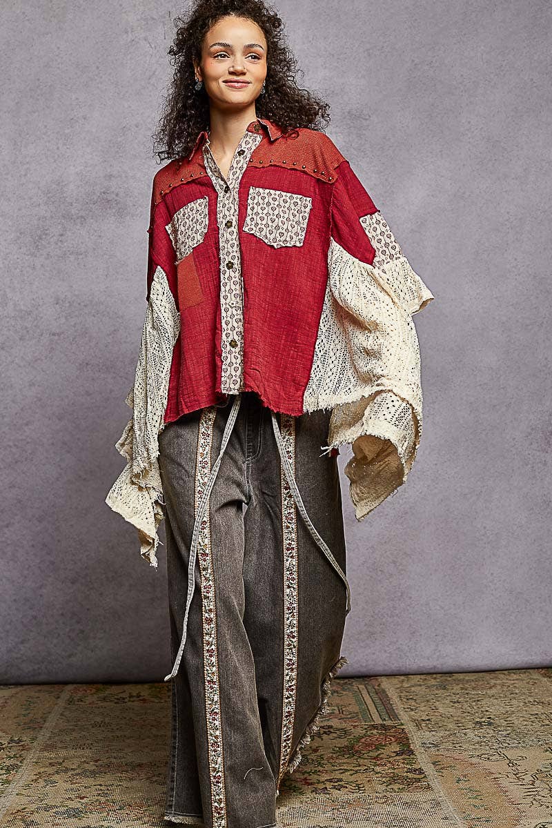 Designed in three quarter sleeve roomy fit shirt top in double gauze with lace, crochet patch, front pockets, ruffled sleeve opening, metal button down, vintage washing, solid color.