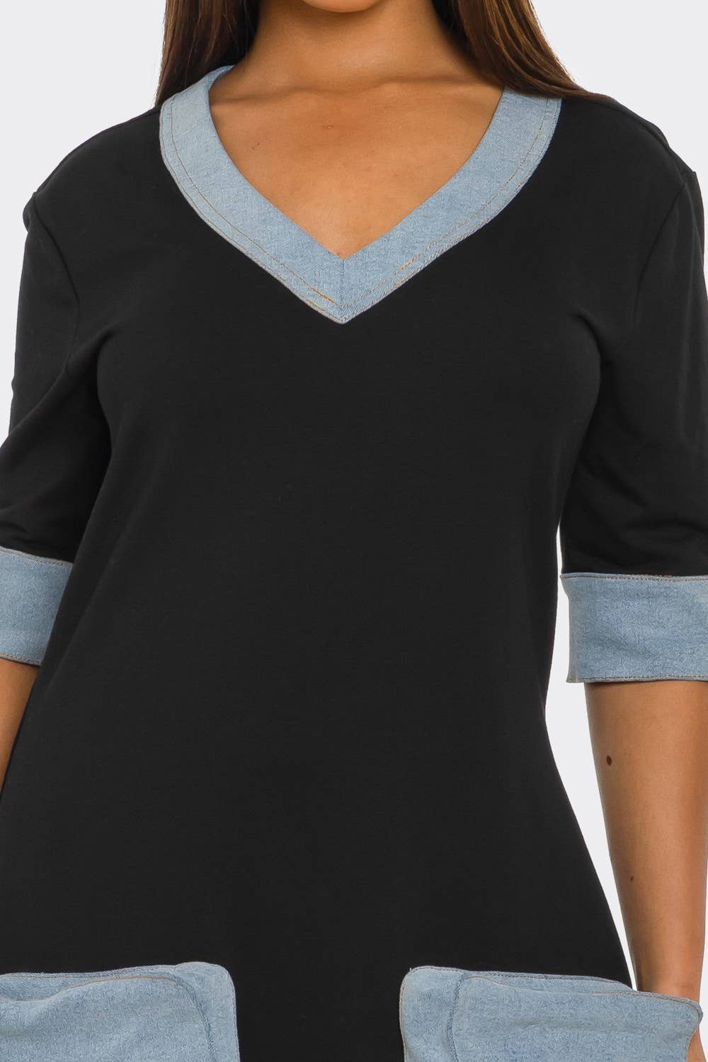 Experience the perfect fusion of comfort and style with the Denim Accent Jumpsuit. This relaxed-fit jumpsuit features a chic V-neckline and elbow-length sleeves, both trimmed with light denim for a playful contrast. The oversized denim patch pockets add a touch of utility-inspired charm while providing functionality. With its drop-crotch silhouette and cuffed hem, this jumpsuit is ideal for casual outings or creative styling moments. Pair it with strappy heels for a dressed-up look or sneakers for a laid-back vibe. Effortlessly cool and versatile, this piece is a wardrobe must-have!
