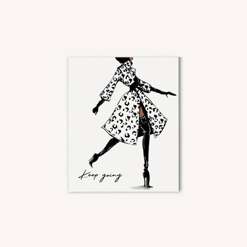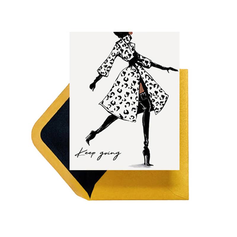 "Keep going" is on the front of this stylish and eco-friendly greeting card. Printed from original artwork, this best-selling design is blank inside making it perfect for multiple occasions including encouragement, friendship and more. The fashionable illustration is multicultural and paired with a Metallic Gold envelope with a black liner for an elegant touch.