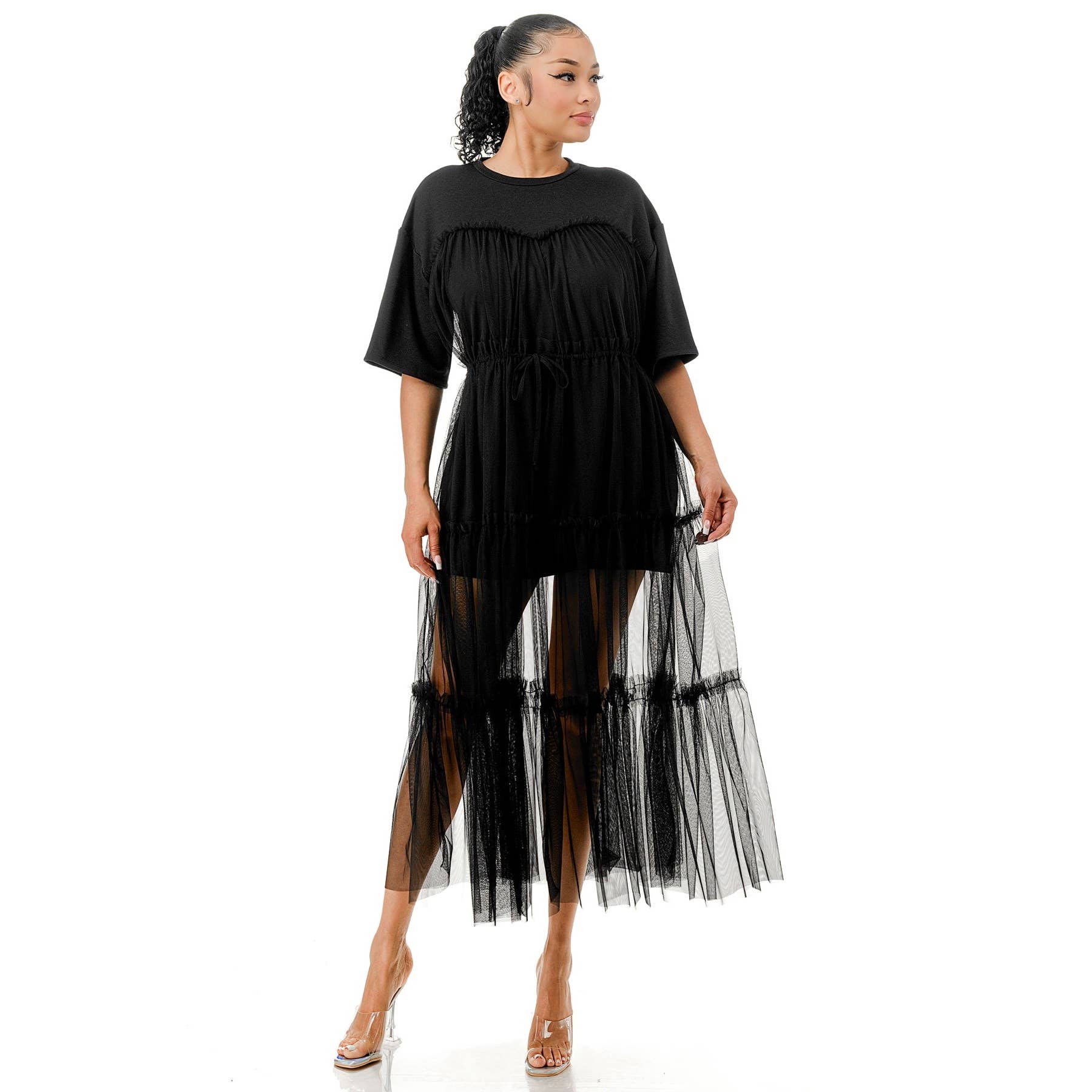Short Sleeve Loose Fit Tiered Ruffle Tulle Overlay Midi T-Shirt Dress